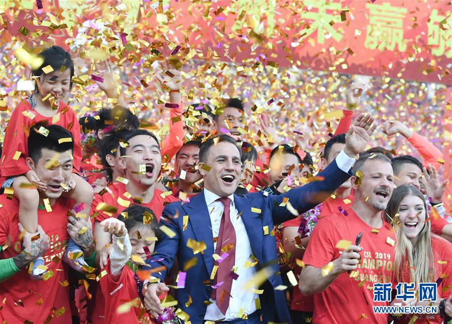 12月1日,广州恒大淘宝队主教练卡纳瓦罗(中)与球员在赛后的庆祝仪式上。 当日,在广州天河体育场进行的2019赛季中国足球协会超级联赛第30轮比赛中,广州恒大淘宝队主场以3比0战胜上海绿地申花队,夺得第八冠。 新华社记者 邓华 摄