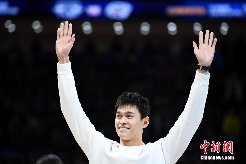 图为游泳运动员孙杨到场观战,向观众致意。 中新社记者 崔楠 摄