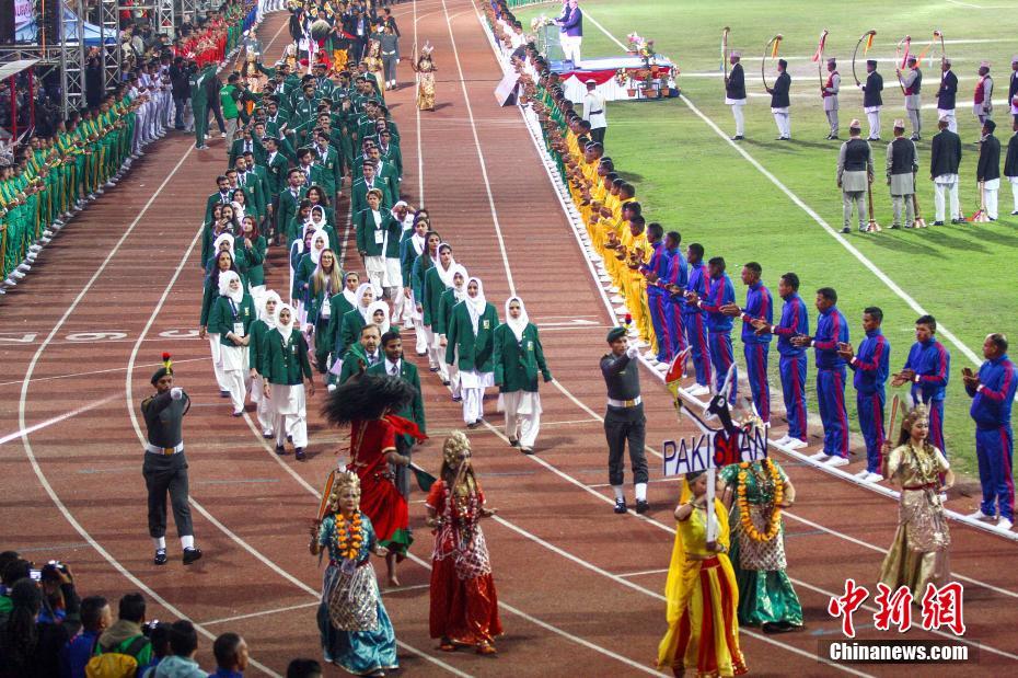 12月1日,第十三届南亚运动会开幕式在尼泊尔加德满都达什拉特体育场举行。图为巴基斯坦代表队进场。 中新社发 普拉丹 摄