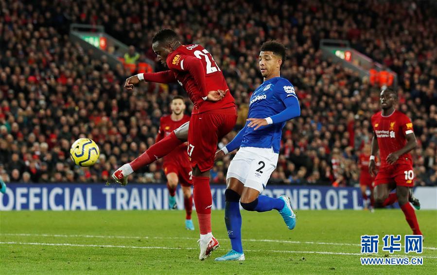 12月4日,利物浦队球员奥里吉(左)在比赛中射门得分。 当日,在2019-2020赛季英超联赛第15轮比赛中,利物浦队主场以5比2战胜埃弗顿队。 新华社/路透