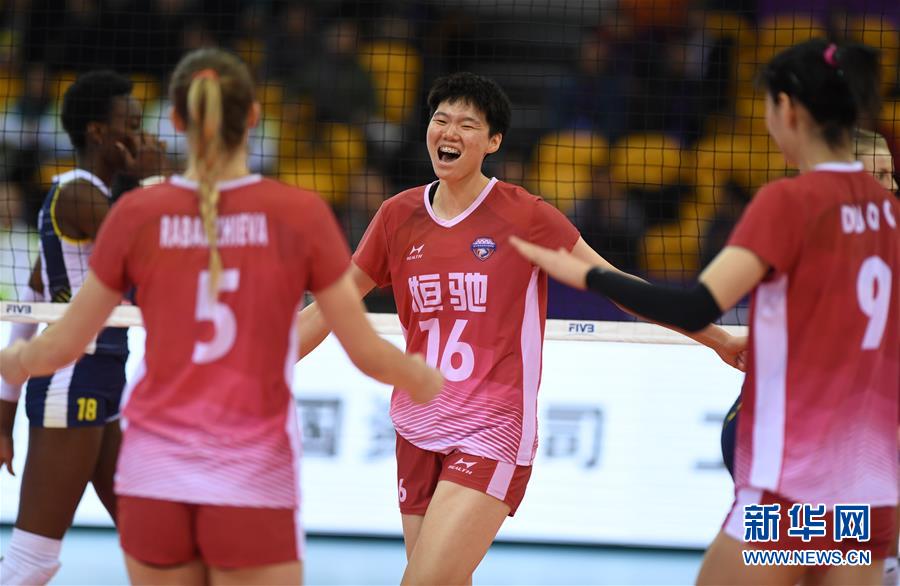 12月4日,广东恒大队球员曹婷婷(中)在比赛中庆祝得分。 当日,在浙江绍兴进行的2019世界女子排球俱乐部锦标赛A组第二轮比赛中,中国广东恒大队以0比3不敌意大利科内利亚诺队。 新华社记者李俊东摄