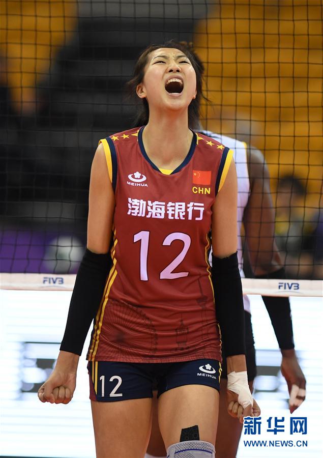12月5日,天津渤海银行队球员袁心玥庆祝胜利。 当日,在浙江绍兴进行的2019世界女子排球俱乐部锦标赛B组第二轮比赛中,中国天津渤海银行队以3比2战胜巴西海滩队。 新华社记者李俊东摄