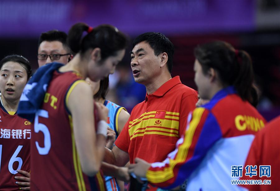12月5日,天津渤海银行队主教练陈友泉(中)在比赛暂停时布置战术。 当日,在浙江绍兴进行的2019世界女子排球俱乐部锦标赛B组第二轮比赛中,中国天津渤海银行队以3比2战胜巴西海滩队。 新华社记者李俊东摄
