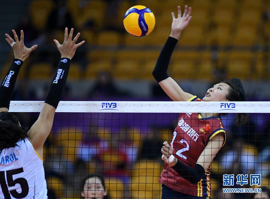 12月5日,天津渤海银行队球员袁心玥(右)在比赛中进攻。 当日,在浙江绍兴进行的2019世界女子排球俱乐部锦标赛B组第二轮比赛中,中国天津渤海银行队以3比2战胜巴西海滩队。 新华社记者李俊东摄