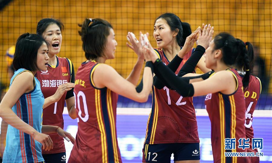 12月5日,天津渤海银行队球员庆祝得分。 当日,在浙江绍兴进行的2019世界女子排球俱乐部锦标赛B组第二轮比赛中,中国天津渤海银行队以3比2战胜巴西海滩队。 新华社记者李俊东摄