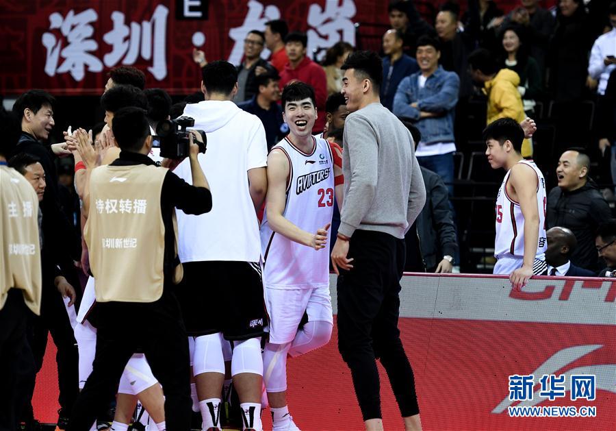 12月5日,深圳马可波罗队球员在比赛后庆祝胜利。 当日,在2019-2020赛季中国男子篮球职业联赛(CBA)常规赛第13轮比赛中,深圳马可波罗队主场以98比95战胜四川五粮金樽队。 新华社记者毛思倩摄