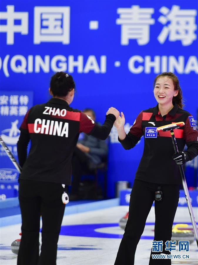 12月6日,中国队选手赵芮伊(左)与队友姜馨迪在比赛中相互鼓励。 当日,在青海多巴国家高原体育训练基地举行的2019中国青海国际冰壶精英赛第二日比赛中,中国女队以4比3战胜俄罗斯女队。 新华社记者张龙摄