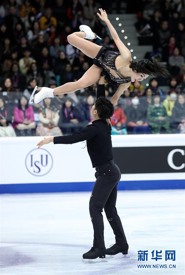 12月5日,隋文静(上)/韩聪在比赛中。 当日,在意大利都灵举行的2019-2020赛季国际滑联花样滑冰大奖赛总决赛双人滑短节目比赛中,中国组合隋文静/韩聪以77.50分的成绩暂列第一。 新华社记者程婷婷摄