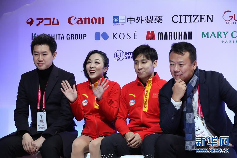 12月5日,隋文静(左二)/韩聪(右二)在比赛后等待分数。 当日,在意大利都灵举行的2019-2020赛季国际滑联花样滑冰大奖赛总决赛双人滑短节目比赛中,中国组合隋文静/韩聪以77.50分的成绩暂列第一。 新华社记者程婷婷摄