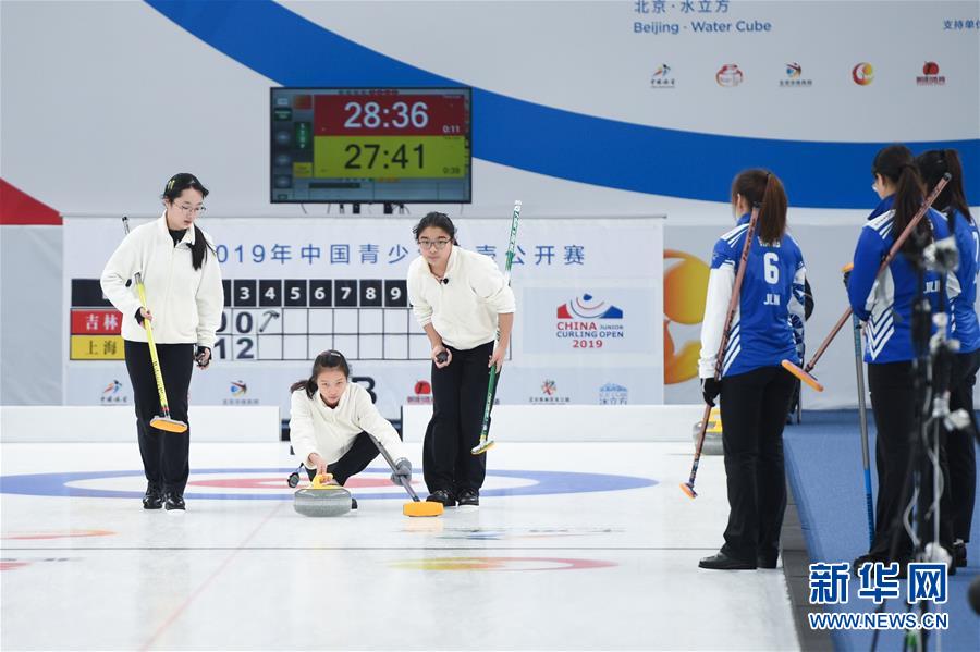 12月8日,上海一队运动员余涵(左二)在中国青少年冰壶公开赛女子冰壶决赛中掷壶。新华社记者鞠焕宗摄