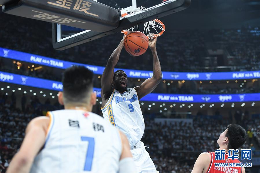 12月8日,北京首钢队球员尤度(中)在比赛中扣篮。 当日,在2019-2020赛季中国男子篮球职业联赛(CBA)常规赛第14轮比赛中,北京首钢队主场以102比100战胜深圳马可波罗队。 新华社记者鞠焕宗摄
