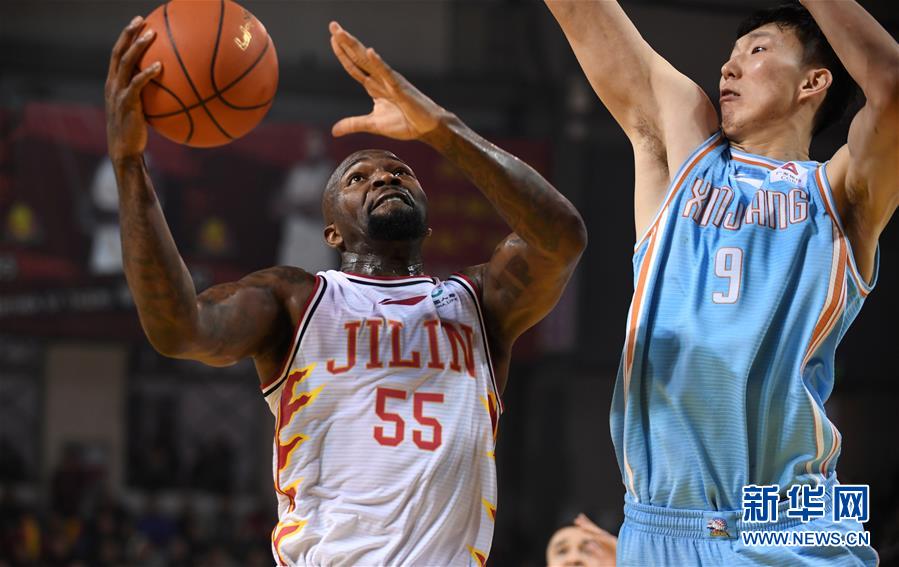 12月8日,吉林九台农商银行队球员琼斯(左)在比赛中进攻。 当日,在2019-2020赛季中国男子篮球职业联赛(CBA)常规赛第14轮比赛中,吉林九台农商银行队主场以124比107战胜新疆伊力特队。 新华社记者林宏摄