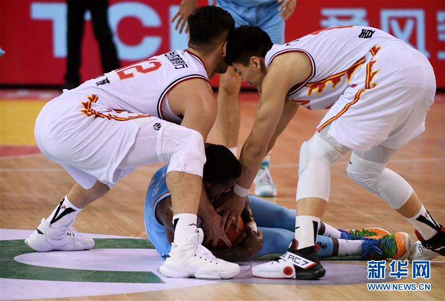 12月8日,新疆伊力特队球员费尔德(中)在比赛中倒地护球。 当日,在2019-2020赛季中国男子篮球职业联赛(CBA)常规赛第14轮比赛中,吉林九台农商银行队主场以124比107战胜新疆伊力特队。 新华社记者林宏摄