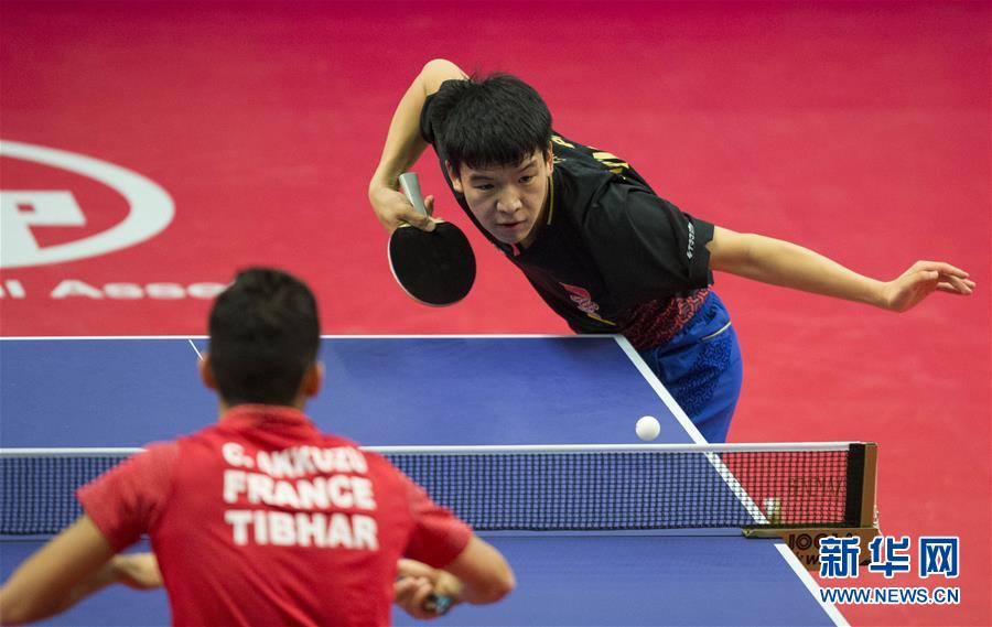 12月8日,中国选手向鹏(右)在比赛中发球。 当日,在加拿大安大略省马克姆市举办的2019年国际乒联世界挑战赛暨北美公开赛男单决赛中,中国选手向鹏以4比2战胜法国选手阿克库祖,夺得冠军。 新华社发(邹峥摄)