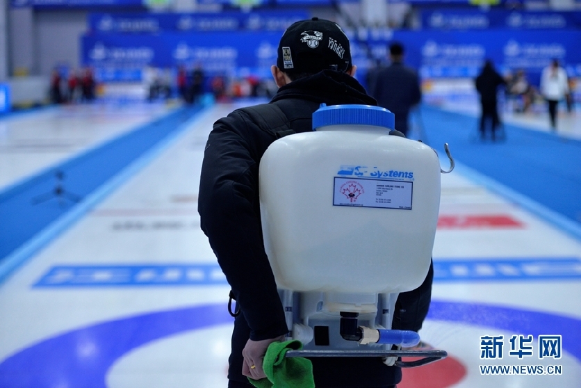 制冰师明来生用打点壶喷洒冰点。新华网发(郭勇良摄)