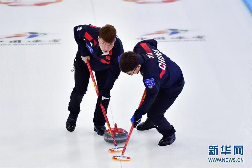 12月7日,中国队选手王智宇(左)和队友许静韬在比赛中擦冰。新华社记者 张龙摄