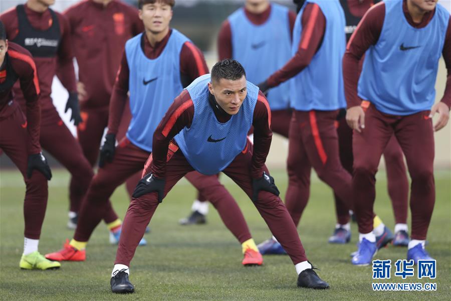 12月9日,中国国家男子足球选拔队球员于大宝(前)在训练中。 当日,中国国家男子足球选拔队进行训练,备战2019年东亚足球锦标赛,中国国家男足选拔队将于12月10日首战对阵日本男足。 新华社记者张可任摄