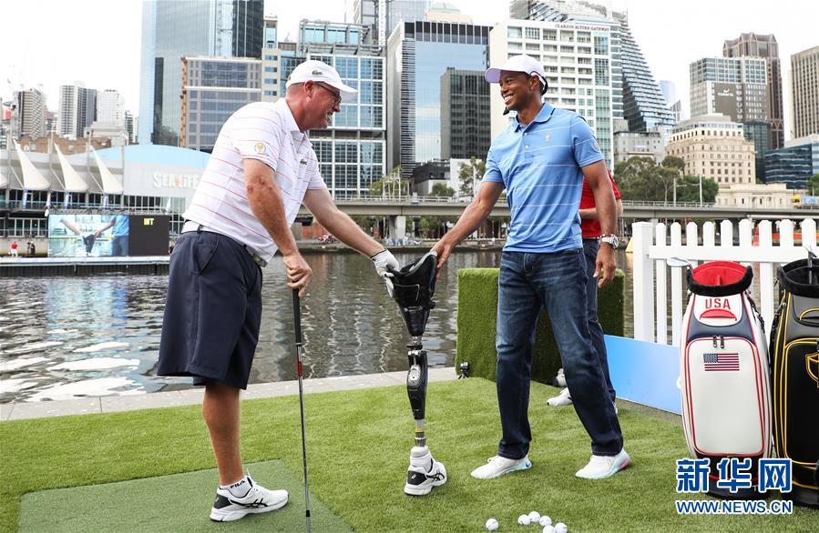 12月9日,澳大利亚残疾球手卢克·沙恩(左)在活动中接过伍兹递过来的假肢。 当日,“老虎”伍兹作为美国队队长,亮相在墨尔本举行的总统杯高尔夫球赛预热活动。 2019年总统杯高尔夫球赛本周将在澳大利亚墨尔本拉开战幕。 新华社记者白雪飞摄