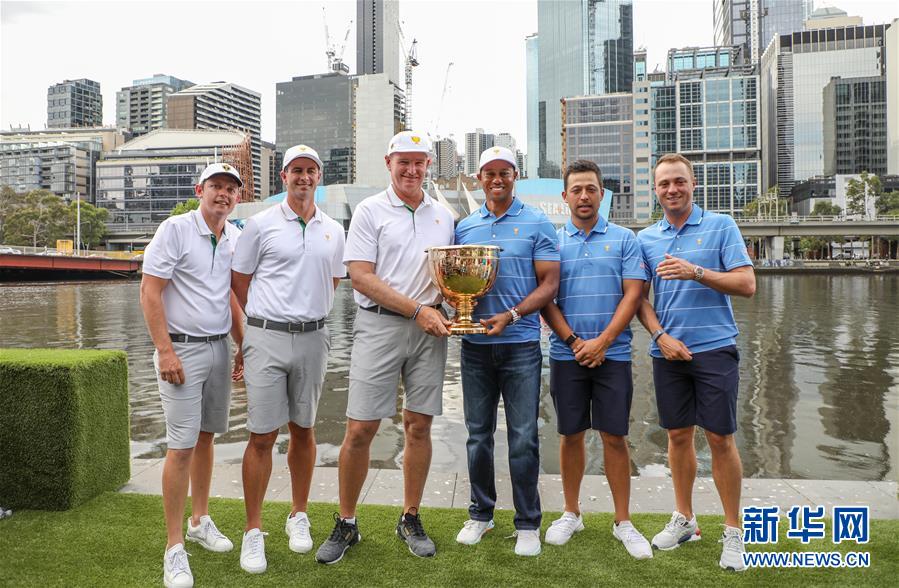 12月9日,伍兹(右三)、南非球手厄尼·艾尔斯(左三)、澳大利亚球手亚当·斯科特(左二)在活动中与总统杯合影。 当日,“老虎”伍兹作为美国队队长,亮相在墨尔本举行的总统杯高尔夫球赛预热活动。 2019年总统杯高尔夫球赛本周将在澳大利亚墨尔本拉开战幕。 新华社记者白雪飞摄