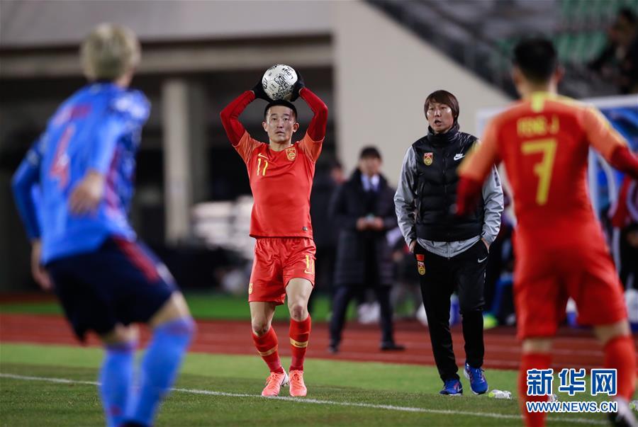 12月10日,中国国家男子足球选拔队球员姜至鹏(左二)在比赛中发界外球。 当日,在韩国釜山举行的2019东亚杯男足比赛中,中国国家男子足球选拔队以1比2不敌日本队。 新华社记者王婧嫱摄