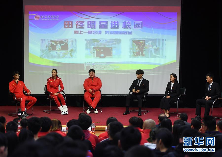 12月10日,王宇(左一)、李玲(左二)、巩立姣(左三)和学生代表在座谈中。 当日,以“同上一堂好课 共筑爱国信念”为主题的田径明星进校园活动在北京体育大学举行。国家田径队队员巩立姣、李玲、王宇与师生一起上课,并座谈交流。 新华社记者贾宇辰摄