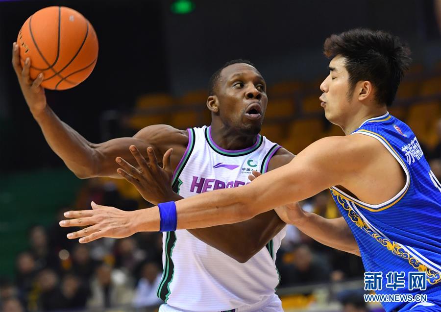 12月10日,山东西王队球员哈德森(左)和苏州肯帝亚队球员吴冠希在比赛中。 当日,在2019-2020赛季中国男子篮球职业联赛(CBA)常规赛第15轮比赛中,山东西王队在济南主场以107比92战胜苏州肯帝亚队。 新华社记者朱峥摄