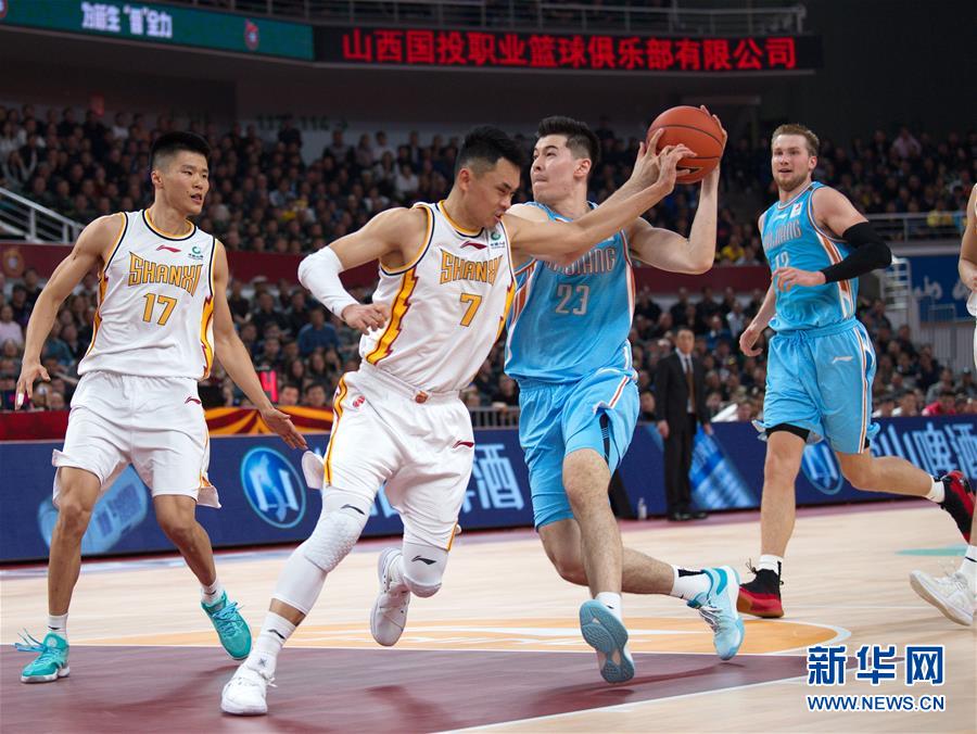 12月10日,新疆伊力特队球员阿不都沙拉木(右二)在比赛中持球进攻。 当日,在2019-2020赛季中国男子篮球职业联赛(CBA)常规赛第15轮比赛中,山西汾酒股份队主场以110比114不敌新疆伊力特队。 新华社记者曹阳摄