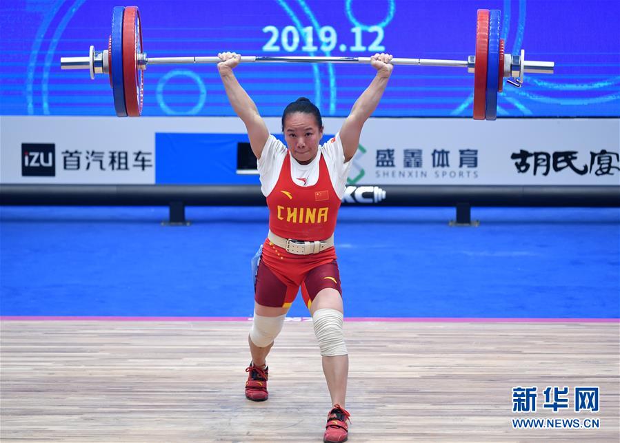 12月10日, 中国选手蒋慧花在49公斤级挺举比赛中。 当日,在天津市举行的2019年“盛鑫”举重世界杯赛暨2020年东京奥运会资格赛女子49公斤级比赛中,中国选手蒋慧花以抓举94公斤、挺举116公斤,总成绩210公斤夺得该级别总成绩冠军,抓举和挺举亚军。 新华社记者李然摄