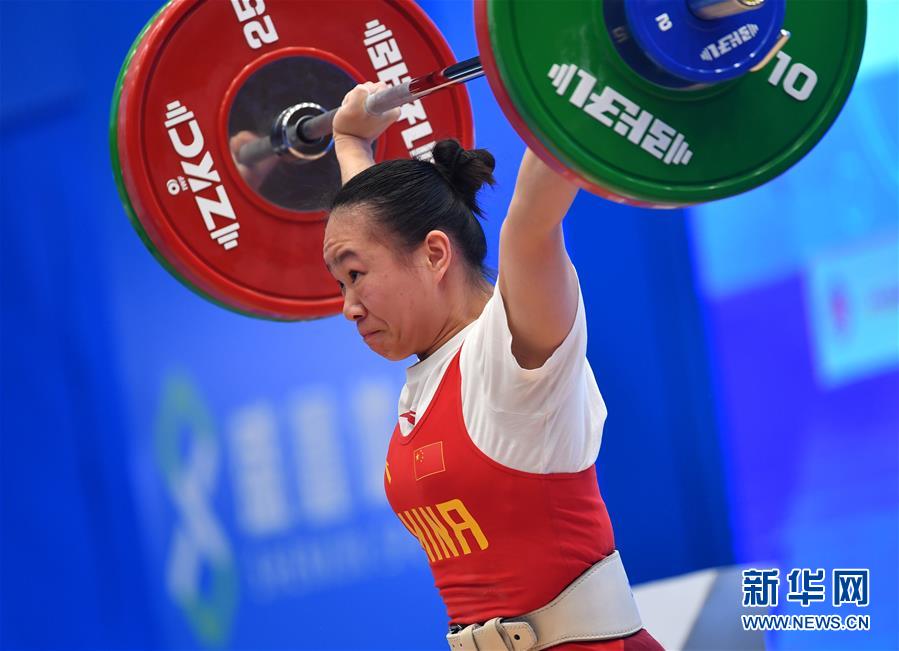 12月10日, 中国选手蒋慧花在49公斤级抓举比赛中。 当日,在天津市举行的2019年“盛鑫”举重世界杯赛暨2020年东京奥运会资格赛女子49公斤级比赛中,中国选手蒋慧花以抓举94公斤、挺举116公斤,总成绩210公斤夺得该级别总成绩冠军,抓举和挺举亚军。 新华社记者李然摄