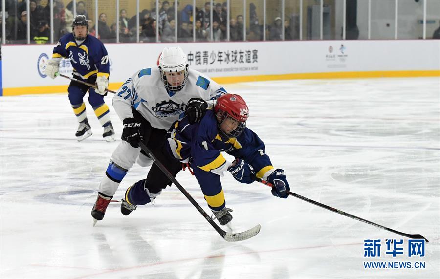 12月10日,双方队员在比赛中拼抢。 当日,由天津青少年冰球队、北京青少年冰球队、俄罗斯青少年冰球队参加的第二届中俄青少年冰球友谊赛在天津举行。在首场比赛中,俄罗斯青少年冰球队以9比5战胜天津青少年冰球队。 新华社记者马平摄