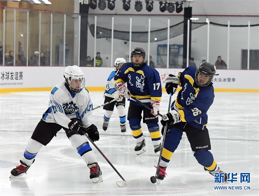 12月10日,天津青少年冰球队队员(右)在比赛中进攻。 当日,由天津青少年冰球队、北京青少年冰球队、俄罗斯青少年冰球队参加的第二届中俄青少年冰球友谊赛在天津举行。在首场比赛中,俄罗斯青少年冰球队以9比5战胜天津青少年冰球队。 新华社记者马平摄