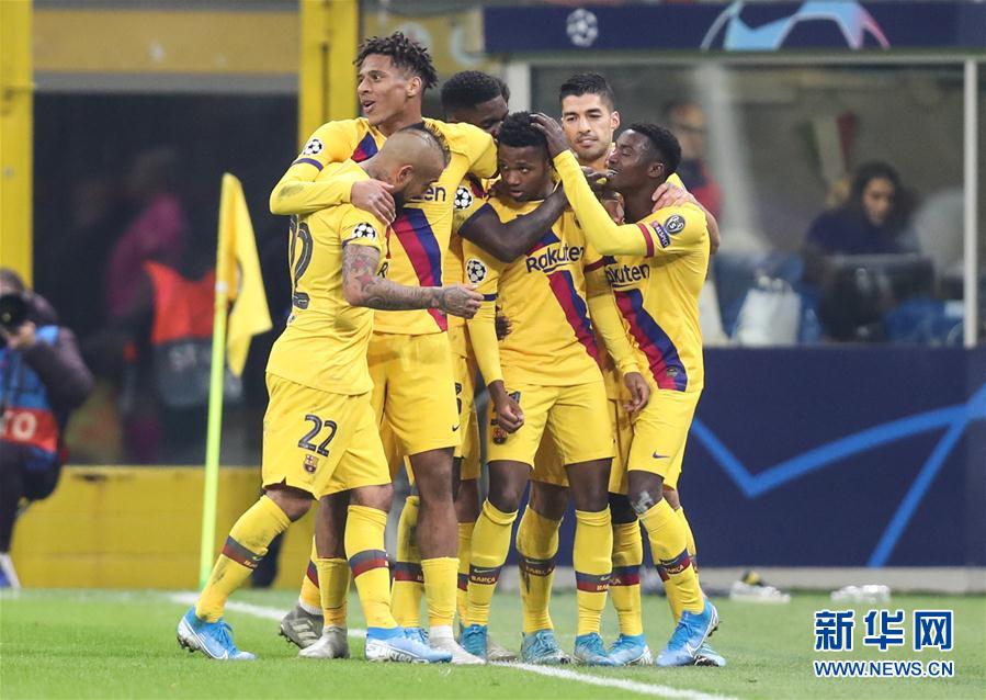 12月10日,巴塞罗那队球员法蒂(右三)在进球后与队友庆祝。 当日,在2019-2020赛季欧冠联赛F组小组赛中,意甲国际米兰队主场以1比2不敌西甲巴塞罗那队,小组排名第三,无缘十六强。 新华社记者程婷婷摄