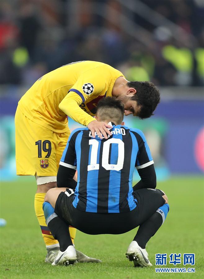 12月10日,巴塞罗那队球员阿莱尼亚(左)在赛后安慰国际米兰队球员劳塔罗·马丁内斯。 当日,在2019-2020赛季欧冠联赛F组小组赛中,意甲国际米兰队主场以1比2不敌西甲巴塞罗那队,小组排名第三,无缘十六强。 新华社记者程婷婷摄