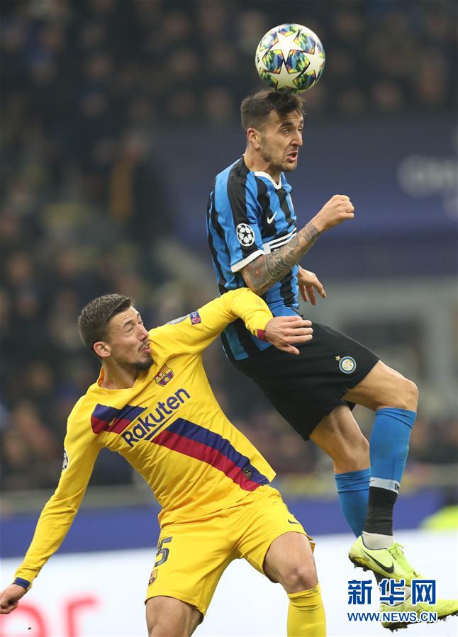 12月10日,国际米兰队球员贝西诺(右)与巴塞罗那队球员朗格莱在比赛中争顶。 当日,在2019-2020赛季欧冠联赛F组小组赛中,意甲国际米兰队主场以1比2不敌西甲巴塞罗那队,小组排名第三,无缘十六强。 新华社记者程婷婷摄