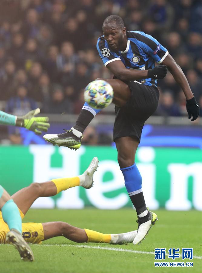 12月10日,国际米兰队球员卢卡库(右)在比赛中射门。 当日,在2019-2020赛季欧冠联赛F组小组赛中,意甲国际米兰队主场以1比2不敌西甲巴塞罗那队,小组排名第三,无缘十六强。 新华社记者程婷婷摄