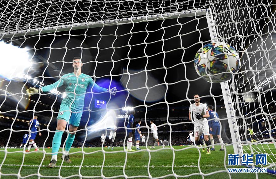 12月10日,切尔西队守门员凯帕(前左)在比赛中未能扑出里尔队球员雷米的进球。 当日,在2019-2020赛季欧冠联赛小组赛H组比赛中,英超切尔西队主场以2比1战胜法甲里尔队,晋级十六强。 新华社/路透