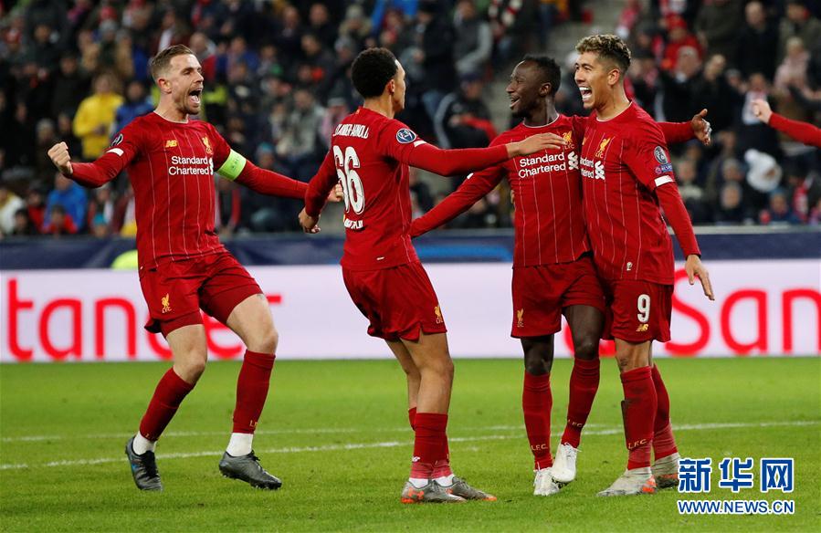 12月10日,利物浦队球员凯塔(右二)在比赛中进球后与队友庆祝。 当日,在2019-2020赛季欧冠联赛小组赛E组比赛中,英超利物浦队客场以2比0战胜奥超萨尔茨堡队,晋级十六强。 新华社/路透
