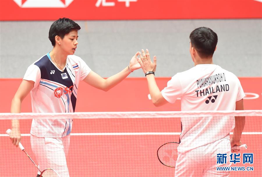 12月11日,泰国选手德查波尔(右)/沙西丽在比赛中庆祝得分。 当日,在2019世界羽联世界巡回赛总决赛混合双打小组赛A组比赛中,泰国选手德查波尔/沙西丽以2比0战胜韩国选手徐承宰/蔡侑玎。 新华社记者 卢汉欣 摄