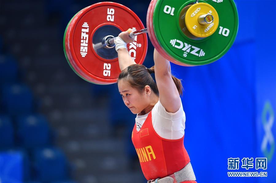 12月11日,中国选手邓薇在64公斤级挺举比赛中。 当日,在天津市举行的2019年“盛鑫”举重世界杯赛暨2020年东京奥运会资格赛女子64公斤级比赛中,中国选手邓薇以抓举117公斤、挺举138公斤,总成绩255公斤获该级别抓举和总成绩冠军及挺举亚军,并创造新的抓举世界纪录 新华社记者李然摄
