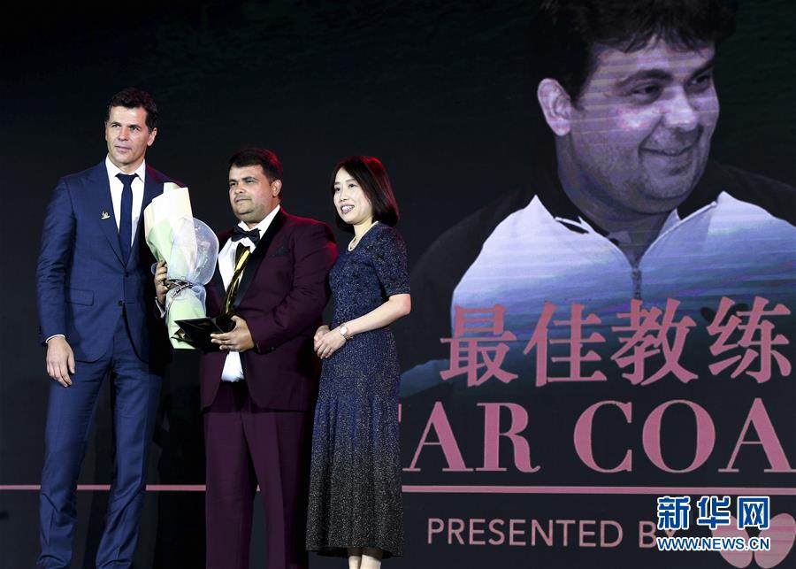 12月11日,波多黎各女乒教练布拉迪米尔·迪亚兹(中)在颁奖盛典上。布拉迪米尔·迪亚兹获年度最佳教练称号。 当日,2019国际乒联球星颁奖盛典在河南省郑州市举行。中国运动员马龙、刘诗雯分获国际乒联2019年度最佳男、女运动员称号。 新华社记者李安摄