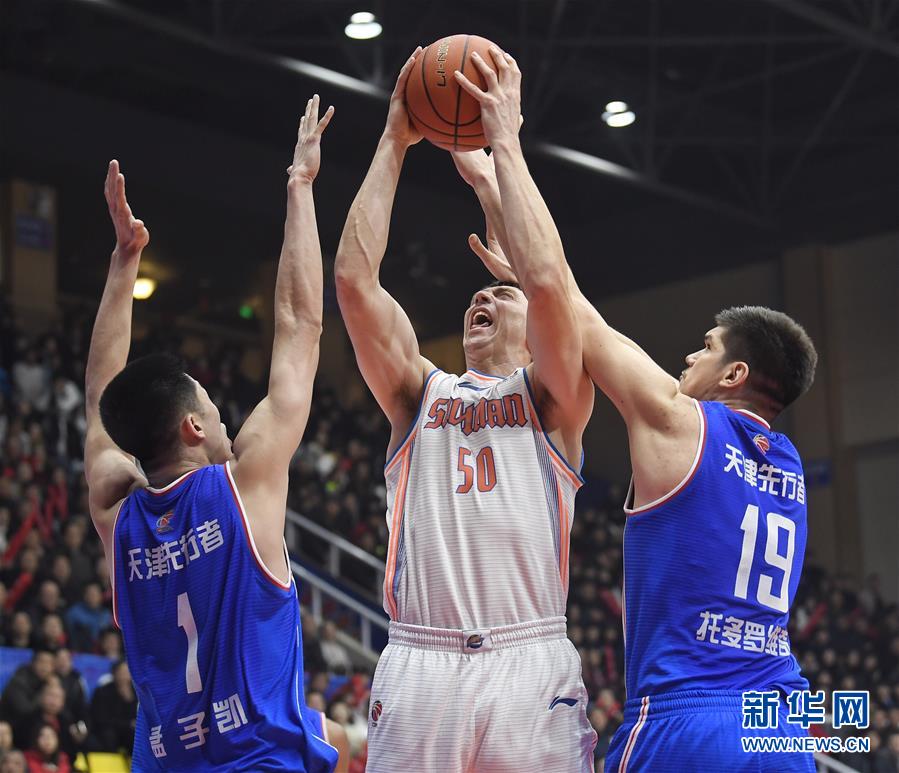 12月11日,四川五粮金樽队球员汉斯布鲁(中)在天津先行者队球员孟子凯(左)和托多罗维奇的防守下带球上篮。 当日,在2019-2020赛季中国男子篮球职业联赛(CBA)常规赛第15轮比赛中,天津先行者队客场以98比94战胜四川五粮金樽队。 新华社记者刘坤摄