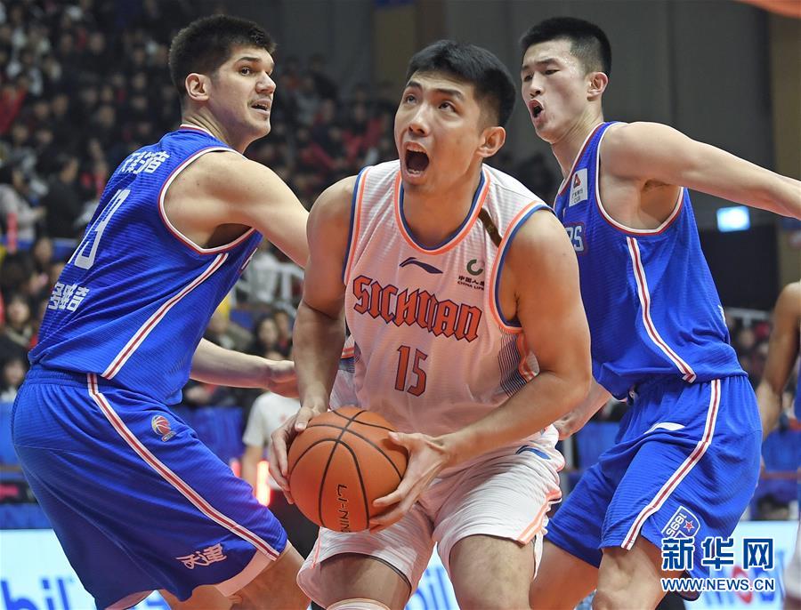 12月11日,四川五粮金樽队球员李原宇(中)在比赛中进攻。 当日,在2019-2020赛季中国男子篮球职业联赛(CBA)常规赛第15轮比赛中,天津先行者队客场以98比94战胜四川五粮金樽队。 新华社记者刘坤摄