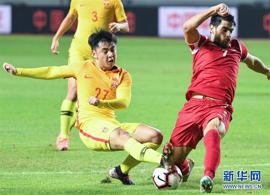 12月11日,中国U22队球员张凌峰(左)与叙利亚U22队球员哈莱德·科尔德赫尔在比赛中拼抢。 当日,在广东珠海进行的2019年中国足协中国之队“世奥杯”珠海国际足球锦标赛中,中国U22队以0比1不敌叙利亚U22队。 新华社记者邓华摄
