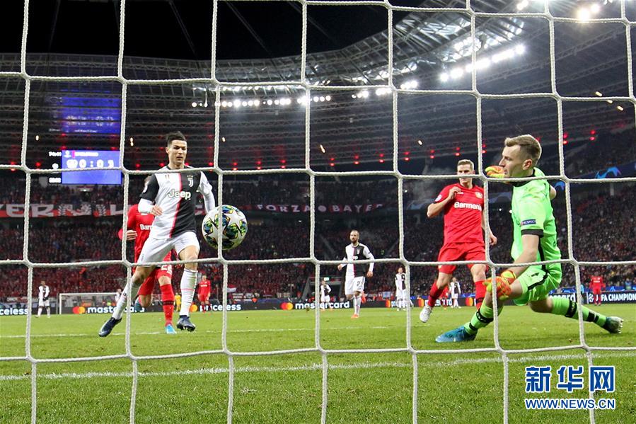 12月11日,尤文图斯队球员克里斯蒂亚诺·罗纳尔多(左一)在比赛中进球。 当日,在2019-2020赛季欧冠联赛小组赛D组比赛中,意甲尤文图斯队客场以2比0战胜德甲勒沃库森队,晋级十六强。 新华社发(约阿希姆·毕瓦勒兹摄)