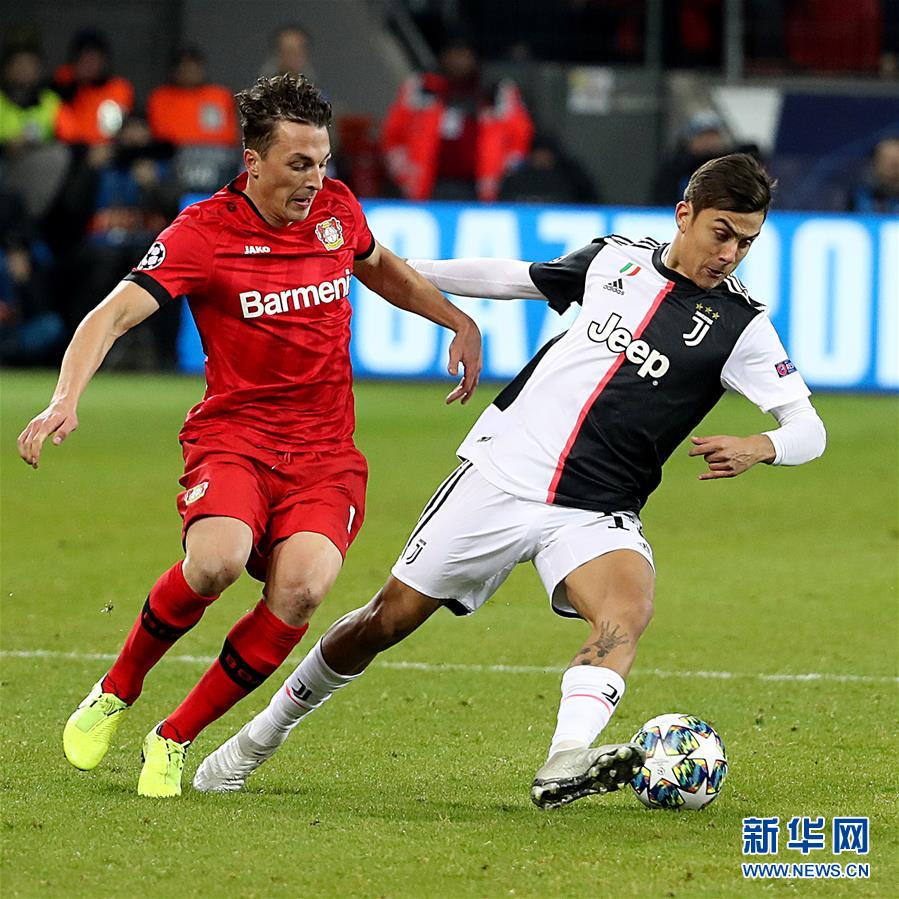 12月11日,尤文图斯队球员迪巴拉(右)在比赛中与勒沃库森队球员鲍姆加特林格拼抢。 当日,在2019-2020赛季欧冠联赛小组赛D组比赛中,意甲尤文图斯队客场以2比0战胜德甲勒沃库森队,晋级十六强。 新华社发(约阿希姆·毕瓦勒兹摄)