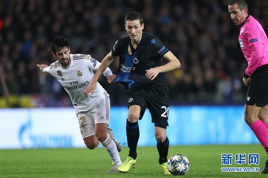 12月11日,布鲁日队球员瓦纳肯(中)在比赛中带球。 当日,在2019-2020赛季欧洲足球冠军联赛A组小组赛中,西甲皇家马德里队客场以3比1战胜比甲布鲁日队,晋级十六强。 新华社记者 郑焕松 摄