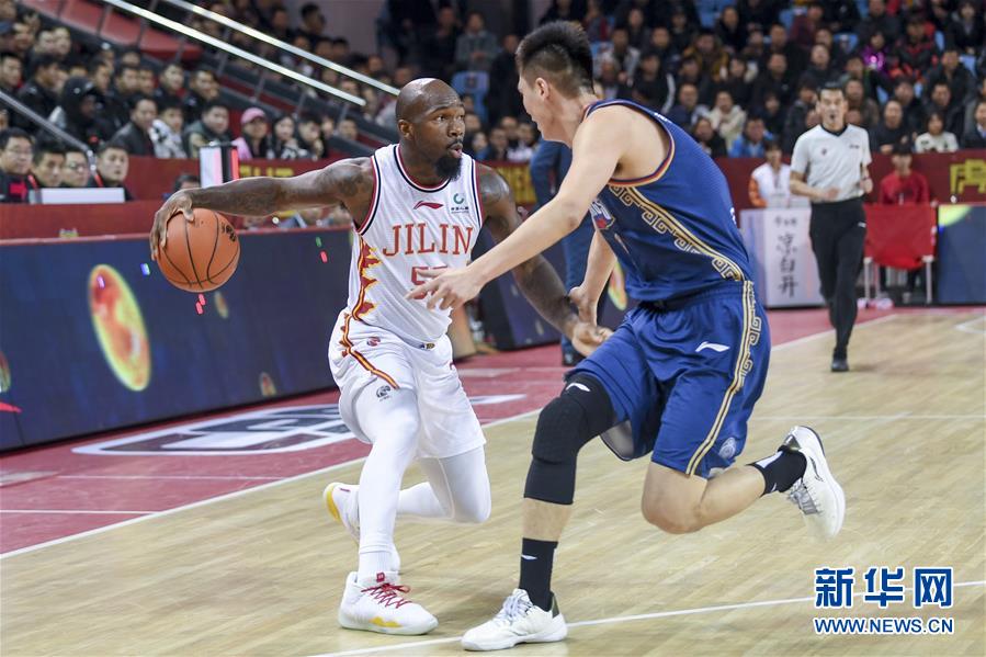 12月12日,吉林九台农商银行队球员琼斯与南京同曦宙光队球员宋建骅在比赛中拼抢。 当日,在2019-2020赛季中国男子篮球职业联赛(CBA)常规赛第16轮比赛中,吉林九台农商银行队主场以124比108战胜南京同曦宙光队。 新华社发(颜麟蕴摄)