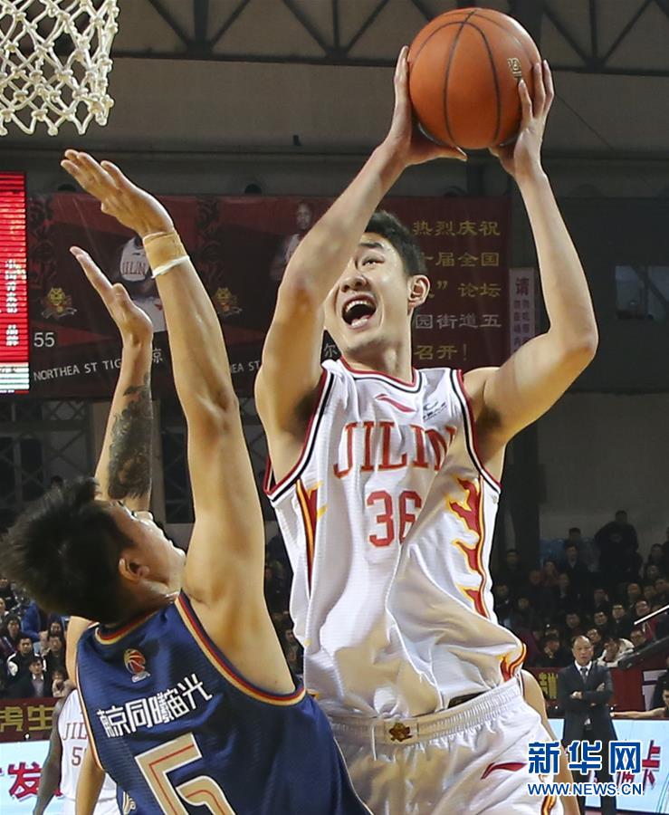 12月12日,吉林九台农商银行队球员代怀博(右)在比赛中上篮。 当日,在2019-2020赛季中国男子篮球职业联赛(CBA)常规赛第16轮比赛中,吉林九台农商银行队主场以124比108战胜南京同曦宙光队。 新华社记者雒圆摄
