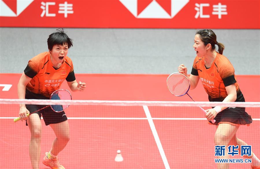 12月12日,陈清晨(左)/贾一凡在比赛中庆祝。 当日,在广州举行的2019世界羽联世界巡回赛总决赛女双A组小组赛中,中国组合陈清晨/贾一凡以2比1战胜印度尼西亚组合波莉/拉哈尤。 新华社记者 卢汉欣 摄