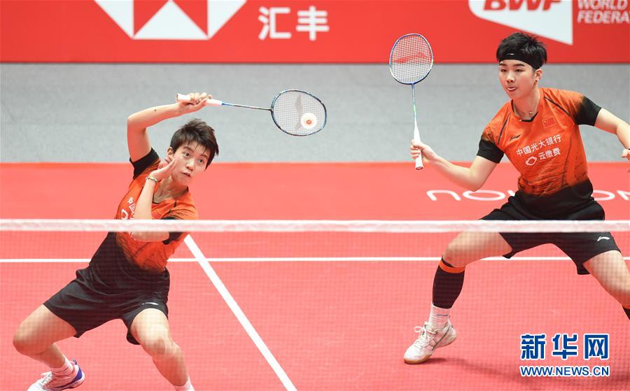 12月12日,中国组合杜玥(左)/李茵晖在比赛中。 当日,在广州举行的2019世界羽联世界巡回赛总决赛女双A组小组赛中,日本组合福岛由纪/广田彩花以2比1战胜中国组合杜玥/李茵晖。 新华社记者卢汉欣摄